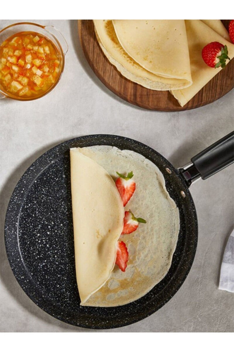Tek parça halinde sunulan bu krep tava, mutfakta ihtiyacınız olan pratikliği ve kolaylığı sağlar; Yapışmaz taban özelliği sayesinde pişirme sırasında yiyeceklerin tavaya yapışmasını önler ve temizliği kolaylaştırır; Şık siyah rengiyle mutfağınıza modern bir dokunuş ekler ve estetik bir görünüm sunar; Granit dış materyali ile dayanıklılık ve uzun ömürlü kullanım vaat eder; Kızartma tavası olarak tasarlanmış olup, çeşitli yemeklerinizi mükemmel şekilde pişirmenize olanak tanır; İç yüzeyi de granitten üretilmiştir, bu sayede ısıyı eşit bir şekilde dağıtarak eşit pişirme sağlar;