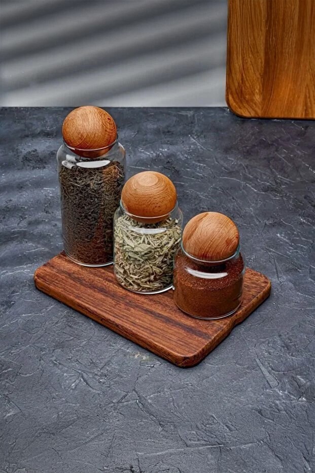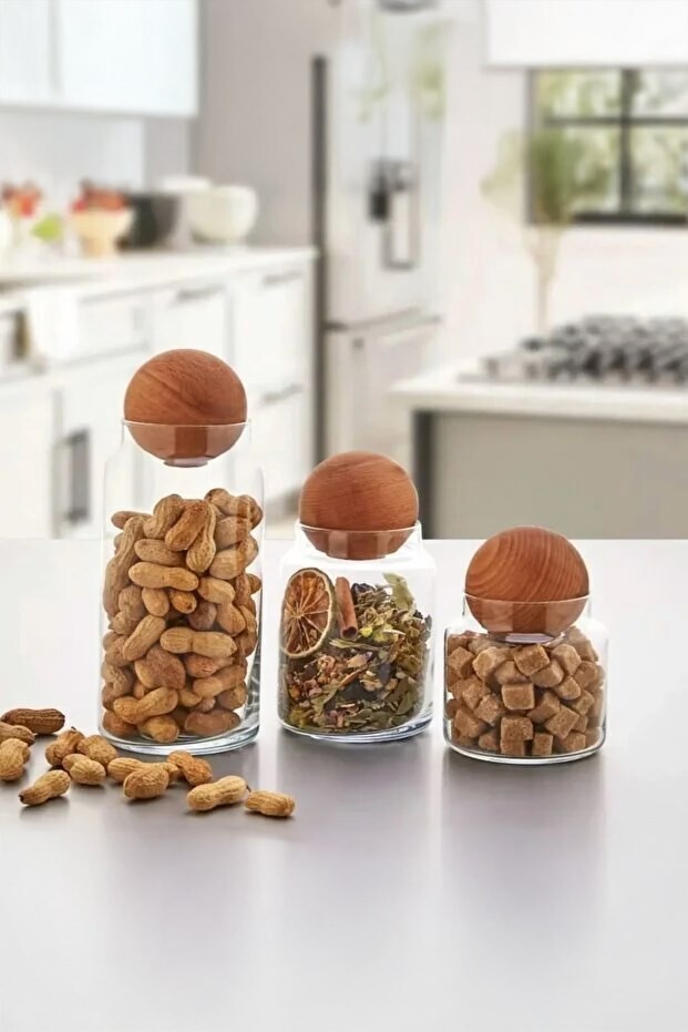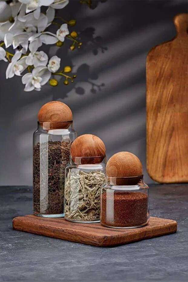 Ahşap Kapaklı Cam Kavanoz Seti (3’lü) – Doğal ve Şık Saklama Çözümü Mutfaklarınıza rustik bir dokunuş katın! %100 doğal ahşap kapaklı, yüksek kaliteli camdan üretilmiş bu 3’lü kavanoz seti hem dekoratif hem de fonksiyonel. Çay, kahve, kuruyemiş, şeker veya baharatlarınızı hijyenik bir şekilde saklayabilirsiniz. Ahşap kaideli sunum tablası ve minik dekoratif çiçek ile birlikte gelen bu set, mutfağınızda estetik bir köşe oluşturmak için ideal. Ürün Özellikleri: Set içeriği: 3 farklı boyda cam kavanoz + ahşap kapaklar Kapak malzemesi: Doğal masif ahşap Kavanoz malzemesi: Kalın cam EKullanım: Gıda saklama, dekoratif düzenleme, hediye alternatifi