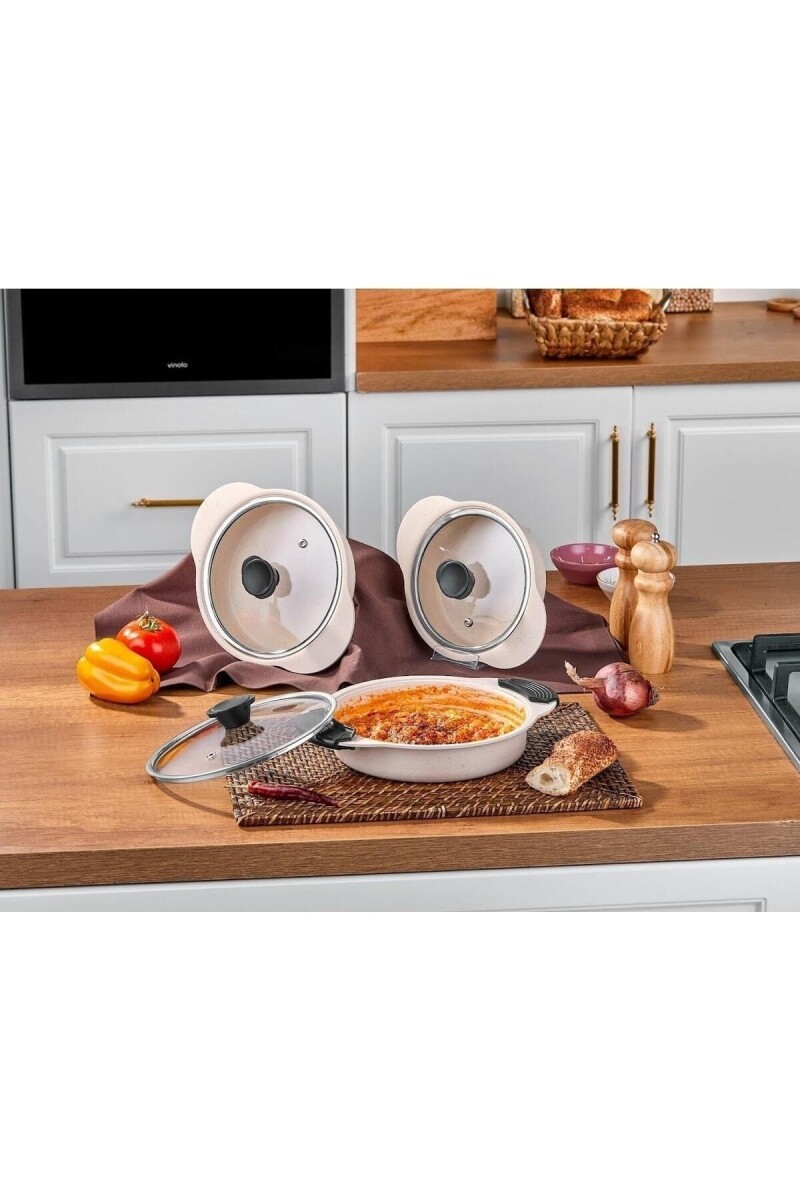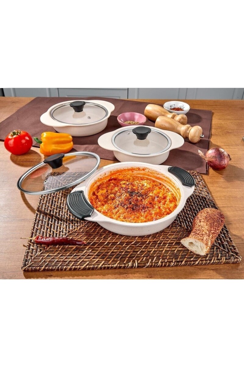 Taç Granit Plus 3'lü Sahan Seti Tak/Çıkar Silikon Saplı Krem;Hem kapaklarında hem de kulplarında özel silikonlar bulunan Granit Plus 3'lü sahan seti, üst düzey pişirme imkanı sunuyor. Kanserojen madde içermeyen yapısı, dayanıklı malzemeler kullanılarak tasarlanmıştır. Buhar delikli cam kapakları sayesinde besinlerin lezzetini yitirmeden pişmesini sağlayan sahanlar, 16, 18 ve 20 cm boyutlarında üretilmiştir. Hem fırın hem de ocakta kullanabileceğiniz sahan seti, yüksek ısıya dayanıklıdır. Bu sayede en lezzetli besinleri pişirebilir, sevdiklerinizle kusursuz pazar kahvaltıları yapabilirsiniz. Geleneksel Türk kahvaltılıklarından, en güzel soslara kadar oldukça geniş bir kullanım alanı sizi bekliyor. Boyutlar: 16 cm (3.5 cm derinlik) 18 cm (4.5 cm derinlik) 20 cm (4 cm derinlik)